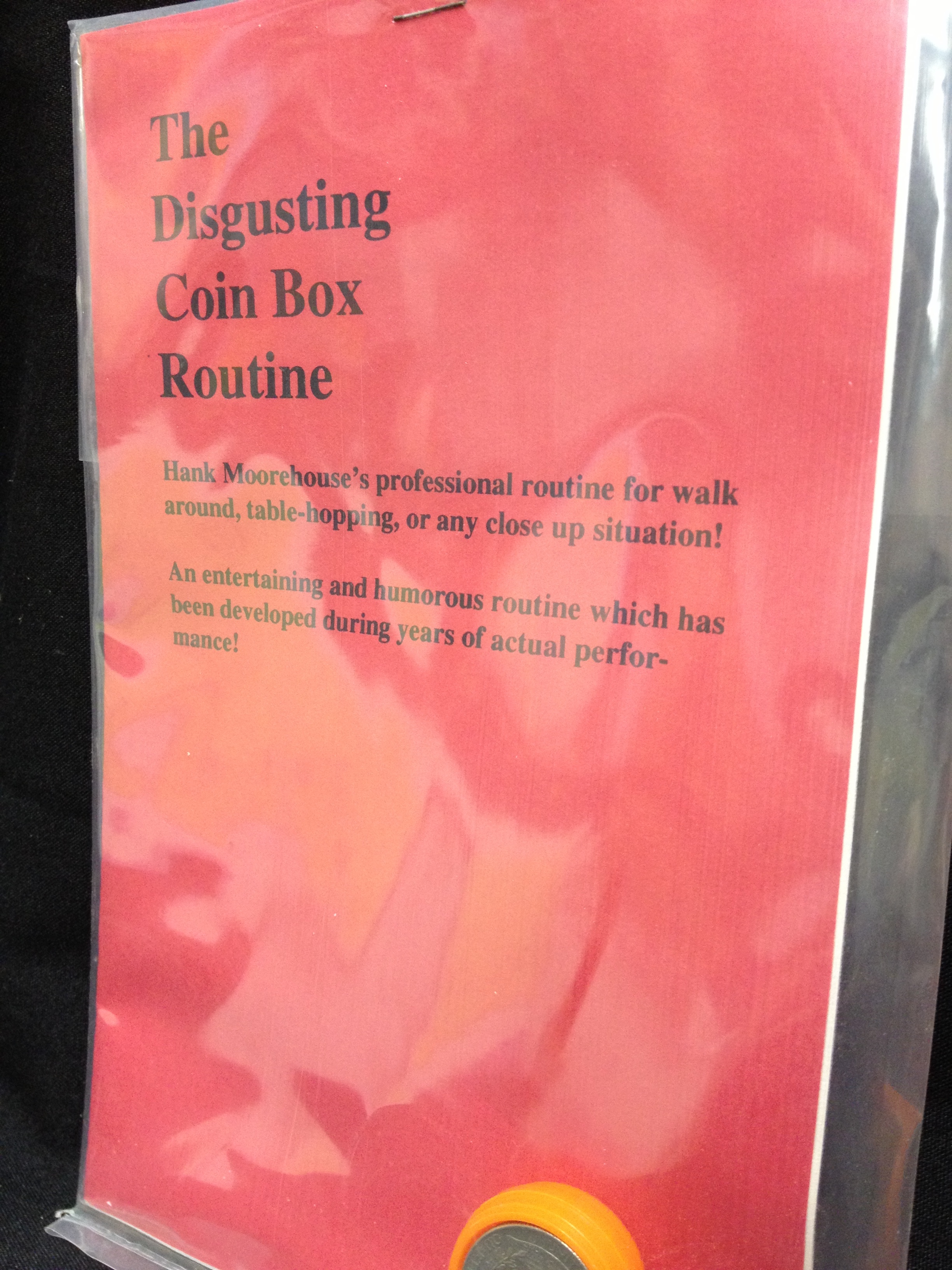 To begin with, Hank "sells" the idea that the coin box is a plastic cap for re-sealing carbonated beverage bottles. The cap does look a lot like one of those caps, and maybe convincing the spectators of this, is what takes all the "heat" off the coin box. Then later in the routine,, when the coins are about to travel from hand to hand, Hank gives the spectators the choice of whether he should cause the coins to travel in  a tasteful manner, or in a very disgusting manner. The effect concludes with the coins travel;ling in a disgusting manner to the other hand and a good laugh! With detailed written p[resentation. Supply your own quarters.