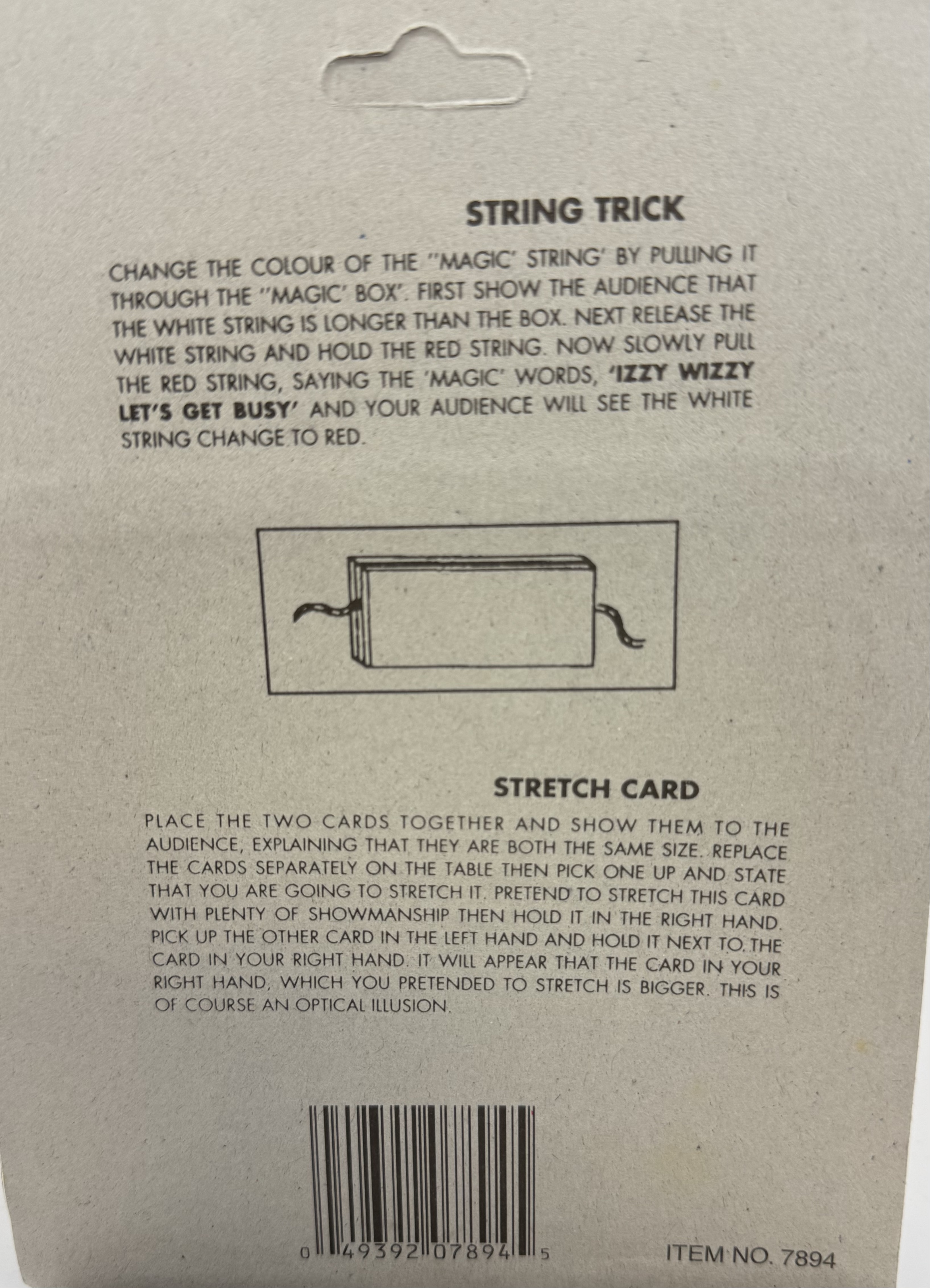 A colorful transformation right before their eyes! Start by showing a white string clearly longer than a small magic box. With a little flair and the magic words—“Izzy Wizzy, let’s get busy!”—you slowly pull the string through the box… and like real magic, it changes color from white to red! It’s visual, surprising, and gets great reactions every time.