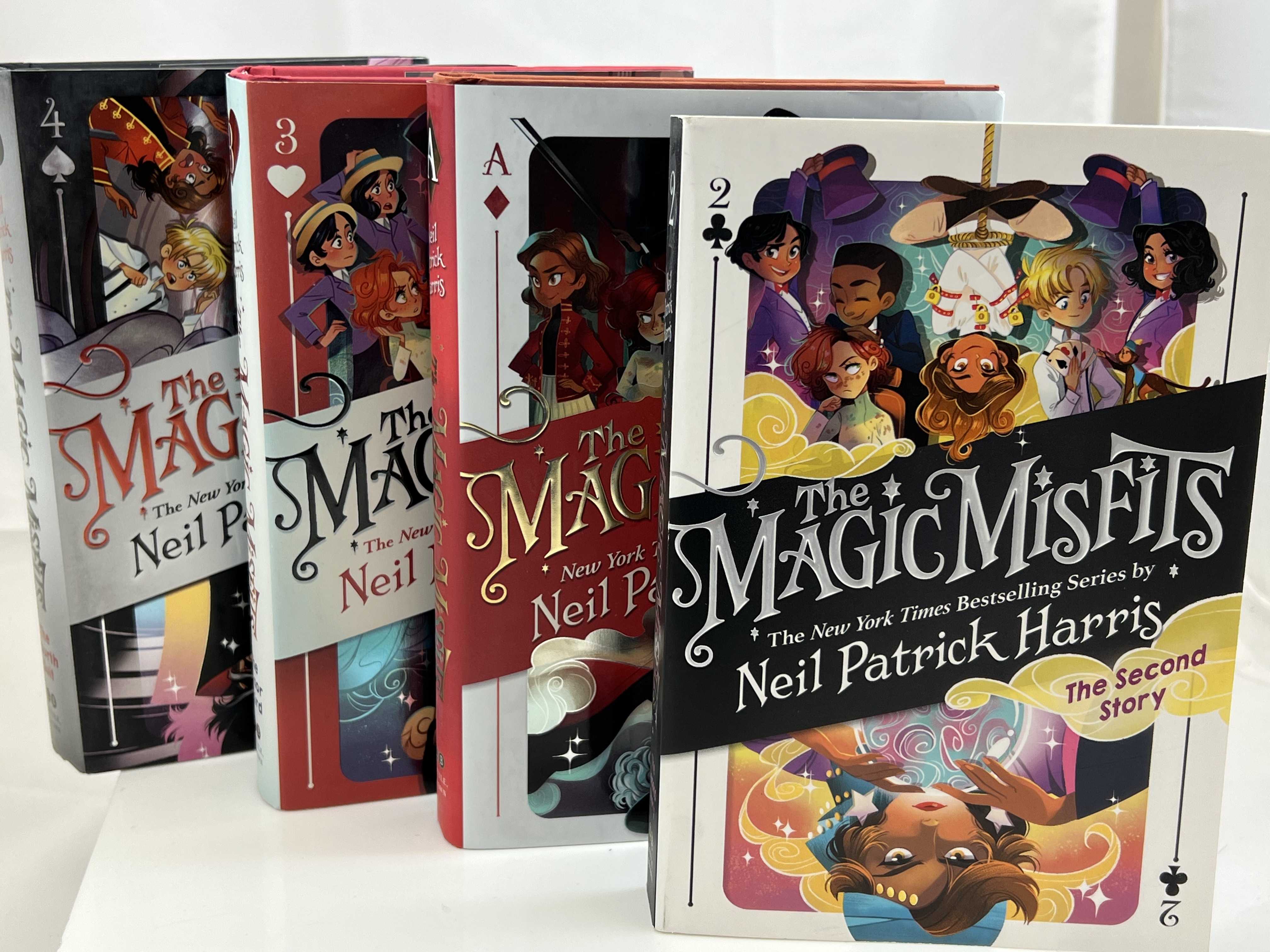 Details: The Magic Misfits Book Series. by Actor & Magician Neil Patrick Harris.See above for pages in each book. Three of the books you receive for hardbound with dust jackets, one book (The Second Story) is a soft cover, perfect bind copy. Each book measures approximately 5 1/2" by 8".