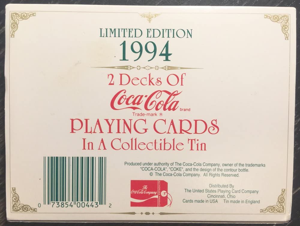 Two decks of playing cards in a collectible Coca Cola decorative metal case. One deck is red border back (this deck has been opened, but not used or shuffled) and the other is green border back(this deck is still in original shrink wrap. The metal tin is in perfect condition with no dents there is a cardboard inner divider inside the tin to separate the two decks of cards. There is a cardboard sleeve used around the tin for packaging and display.