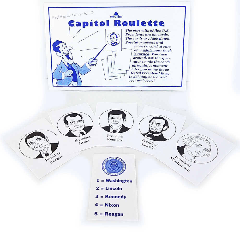 Imagine having Presidents Washington, Lincoln, Kennedy, Nixon and Reagan as your magical assistants! With this card trick, they will help you prove that you have ESP beyond a doubt. The portraits of five U.S. Presidents are on cards, face down. Spectator selects and moves a card at random while your back is turned. You turn around and ask the spectator to mix up the cards again. A moment later you name the selected President! Easy to do and may be worked over and over.