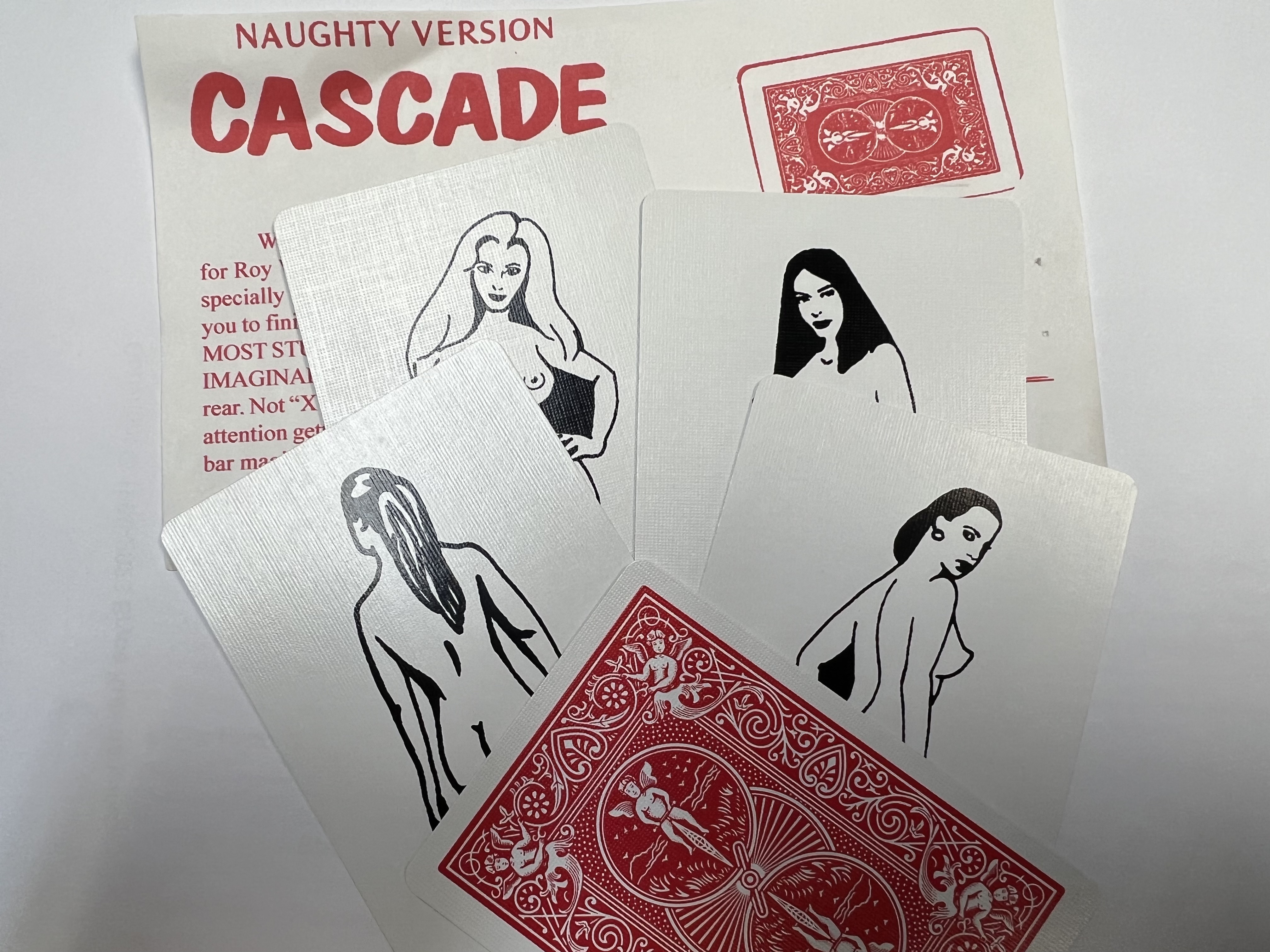 In Roy Walton’s terrific effect, “Cascade”, four cards turn face up, then face down in a most remarkable manner. At the finish of the original effect, the performer showed he had been using trick cards- two have blank faces and two others have gaudy colored backs!! And the cards can be examined!