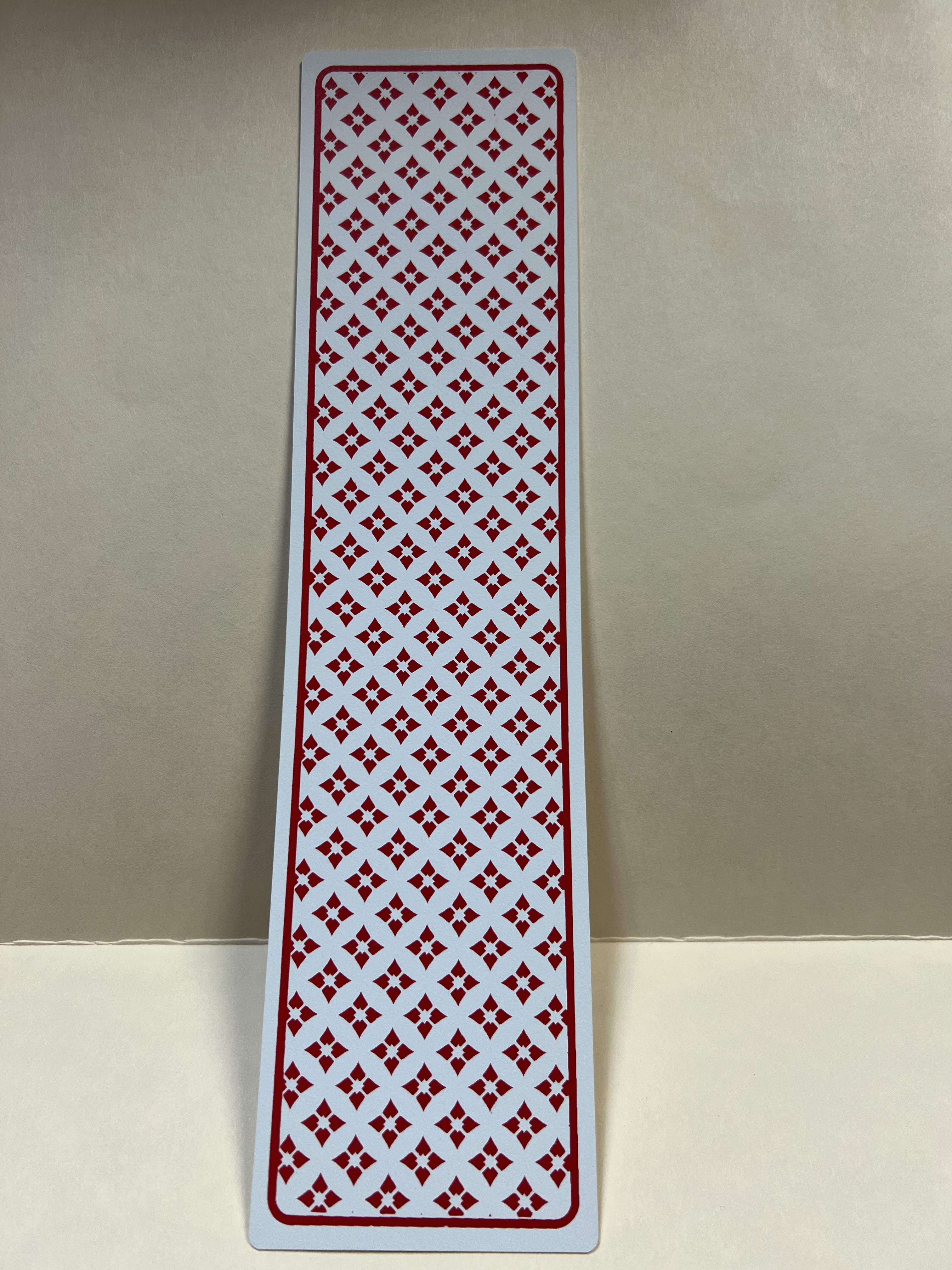 Card is approximately 2.5" x 10". Back is a red pattern back. card is silk-screened on plastic.