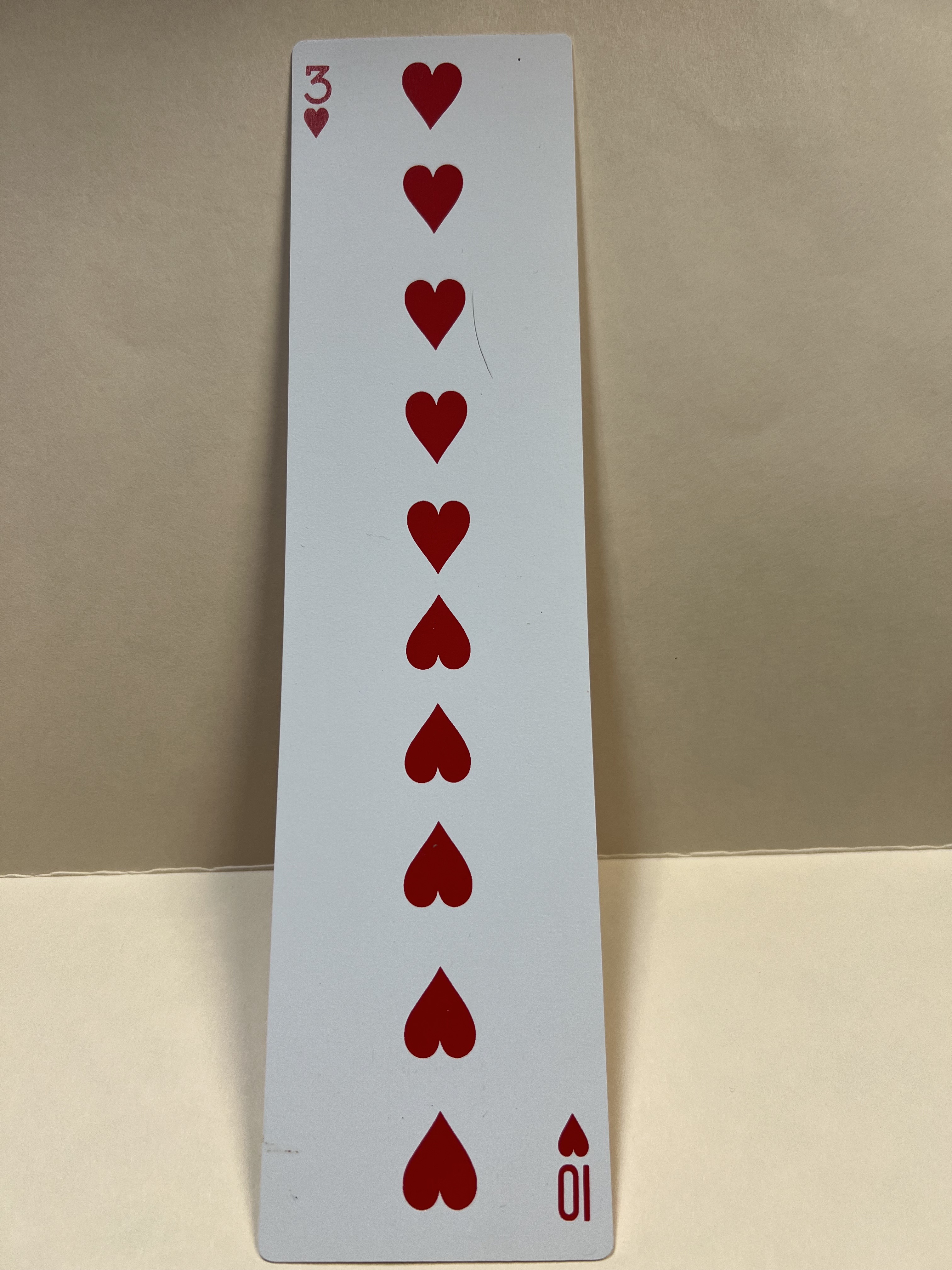 Includes: A Plastic card with Three of Hearts printed on one end and the Ten of Hearts on other end. Use your own deck to force the card.
