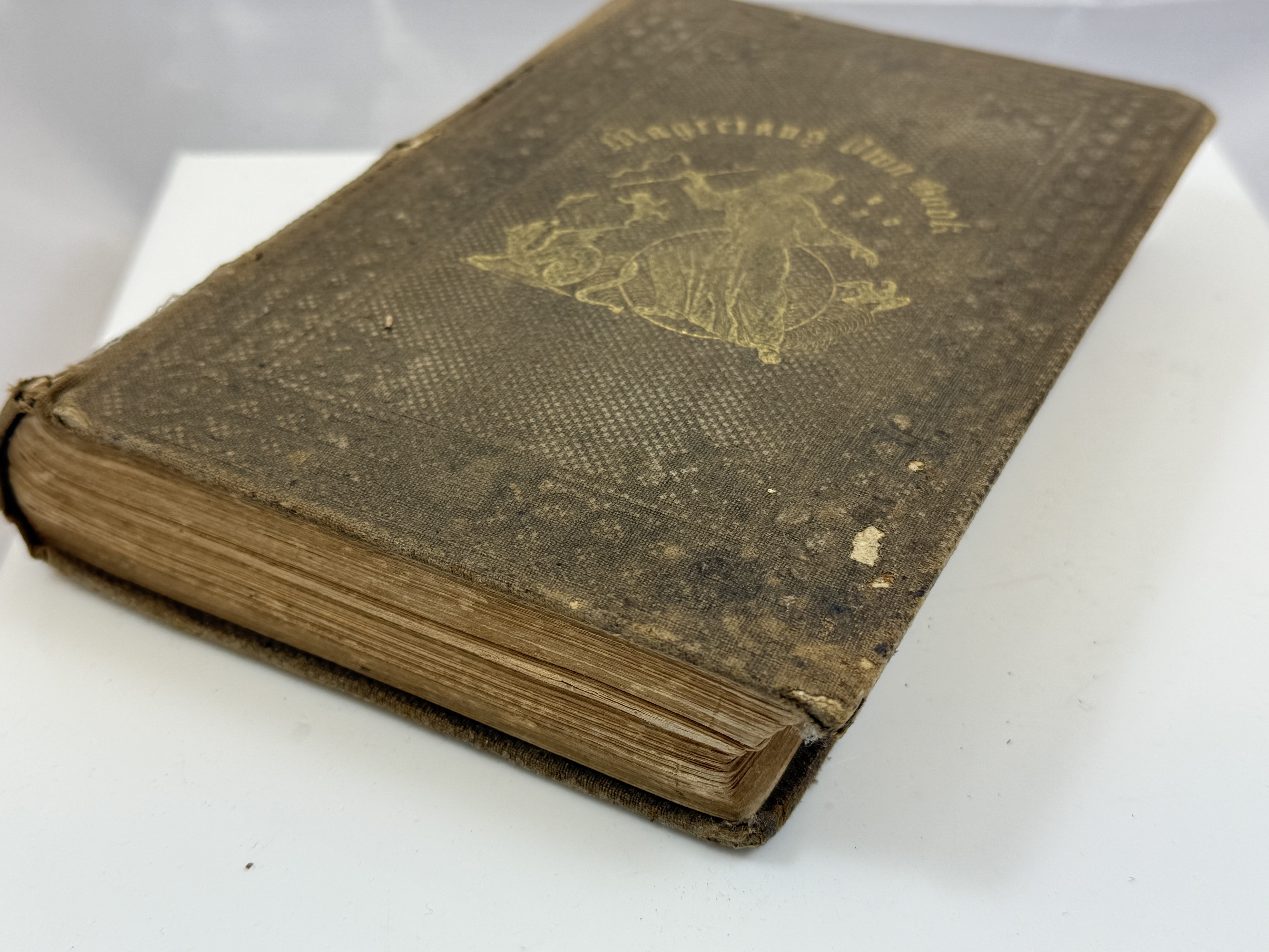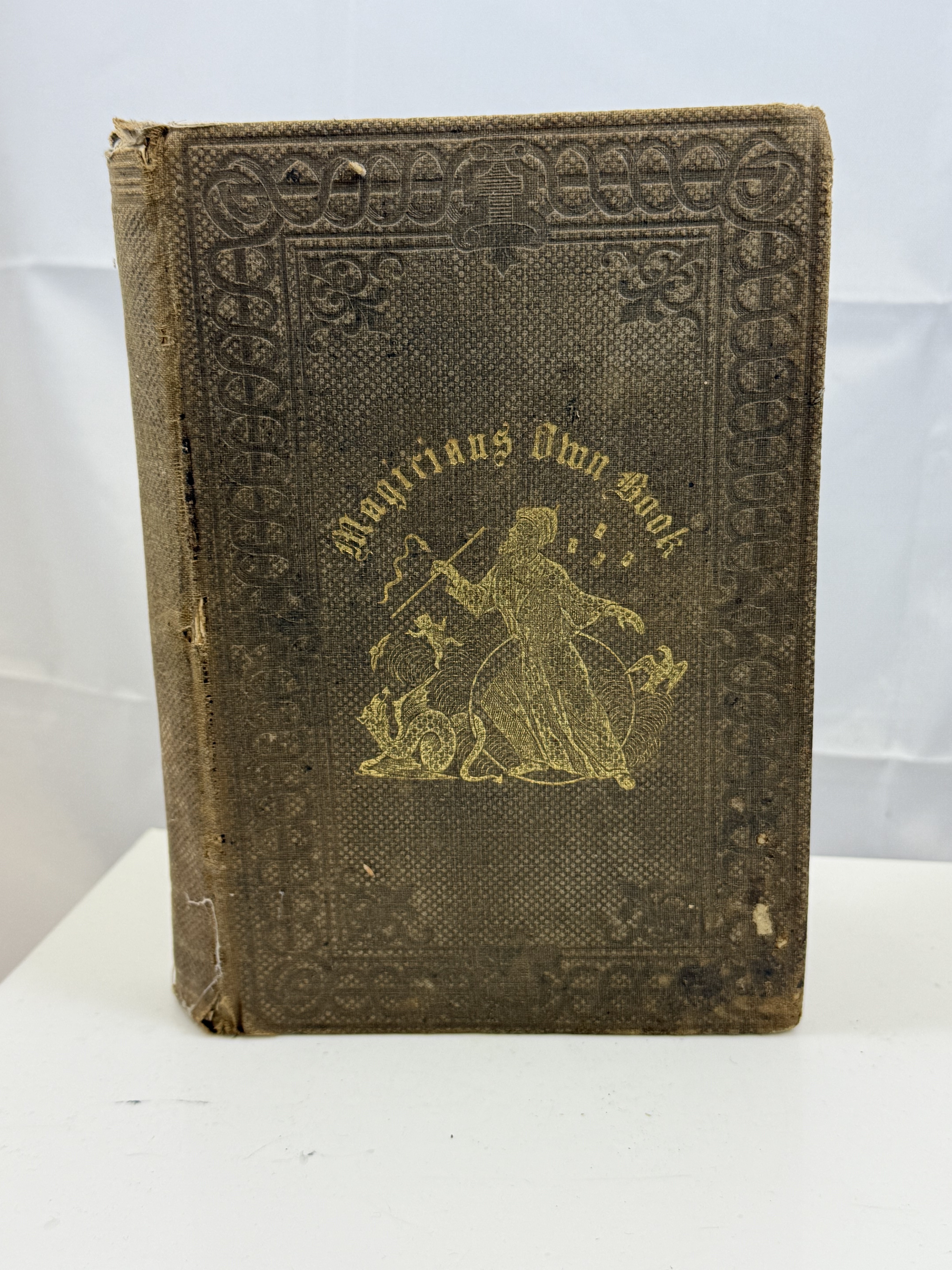 This is an authentic antique hardcover edition of The Magician’s Own Book, showing signs of its age and well-earned shelf life. The decorative cloth cover retains its embossed detailing and gold-stamped illustration, though both front and back show noticeable fading and surface wear. The spine has fraying at both the head and foot, with wear to the corners and some splitting along the edges. Surface soiling and foxing are present, particularly along the fore-edge and rear cover.