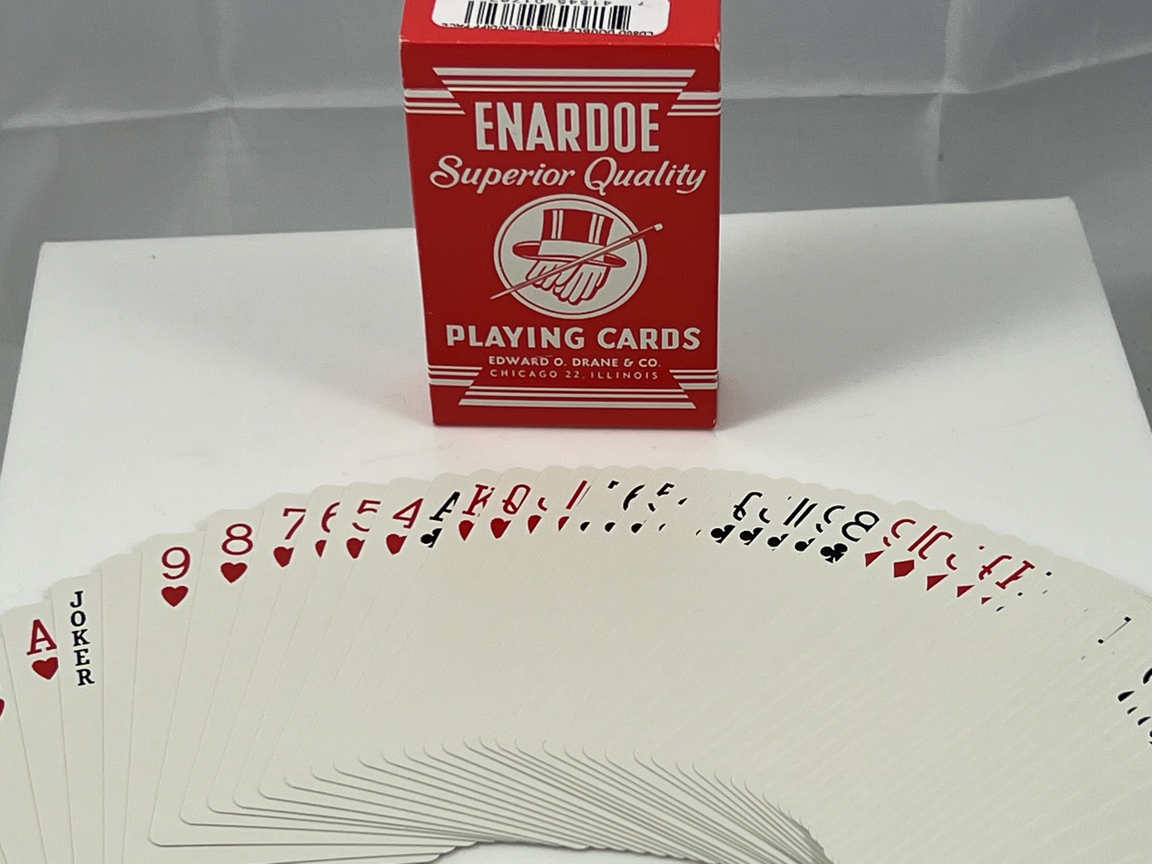 These decks were printed in Belgium for the Edward O. Drane Company of Chicago, IL probably in the 70s. The Drane company produced a complete line of magic under the trade name "Enardoe™" and these Double Face cards were used in making up many various card packet tricks. The darn Co. was purchased by Philip Morris of the famous Morris Costume Company of Charlotte, NC during the 1980s.