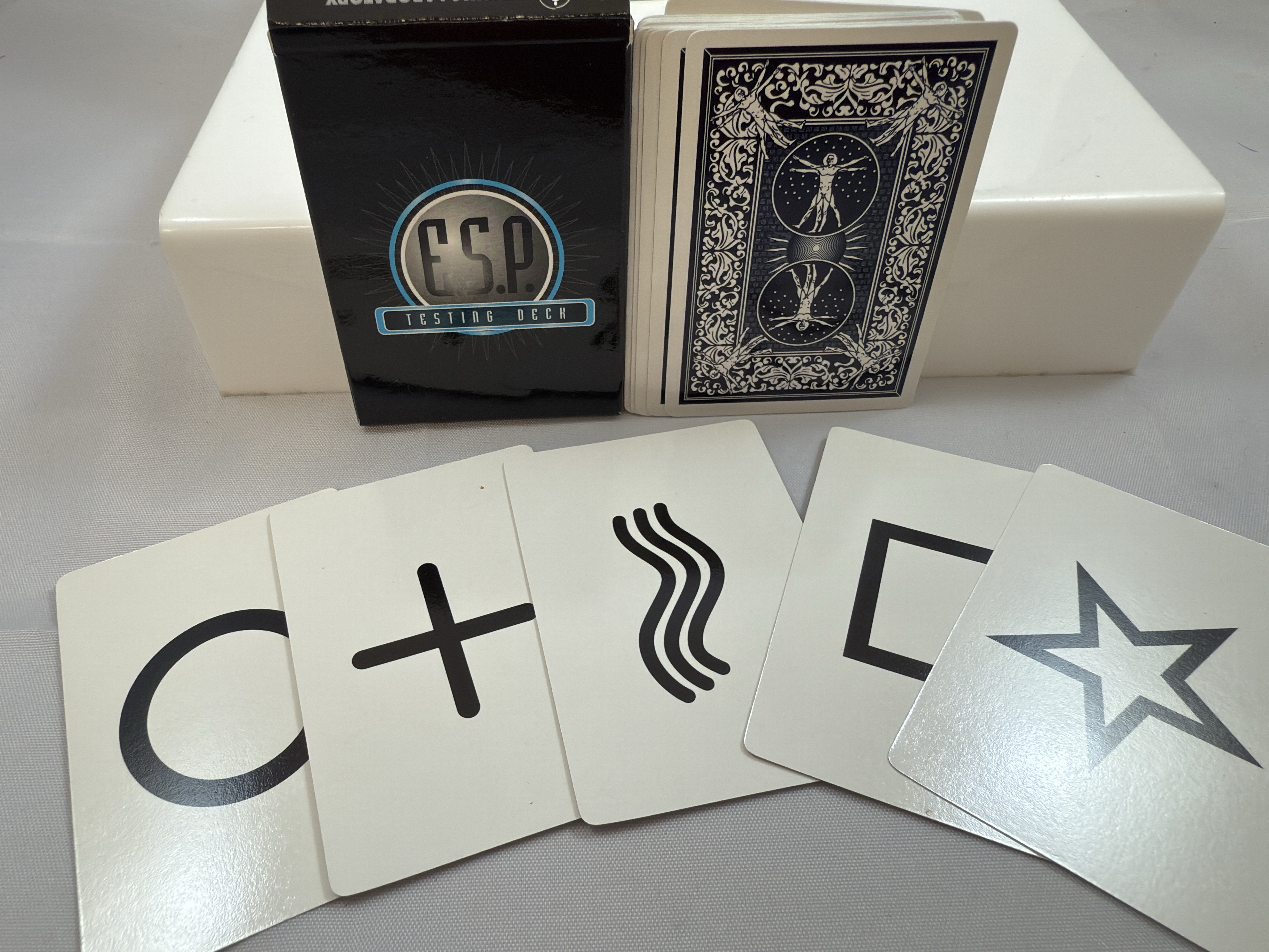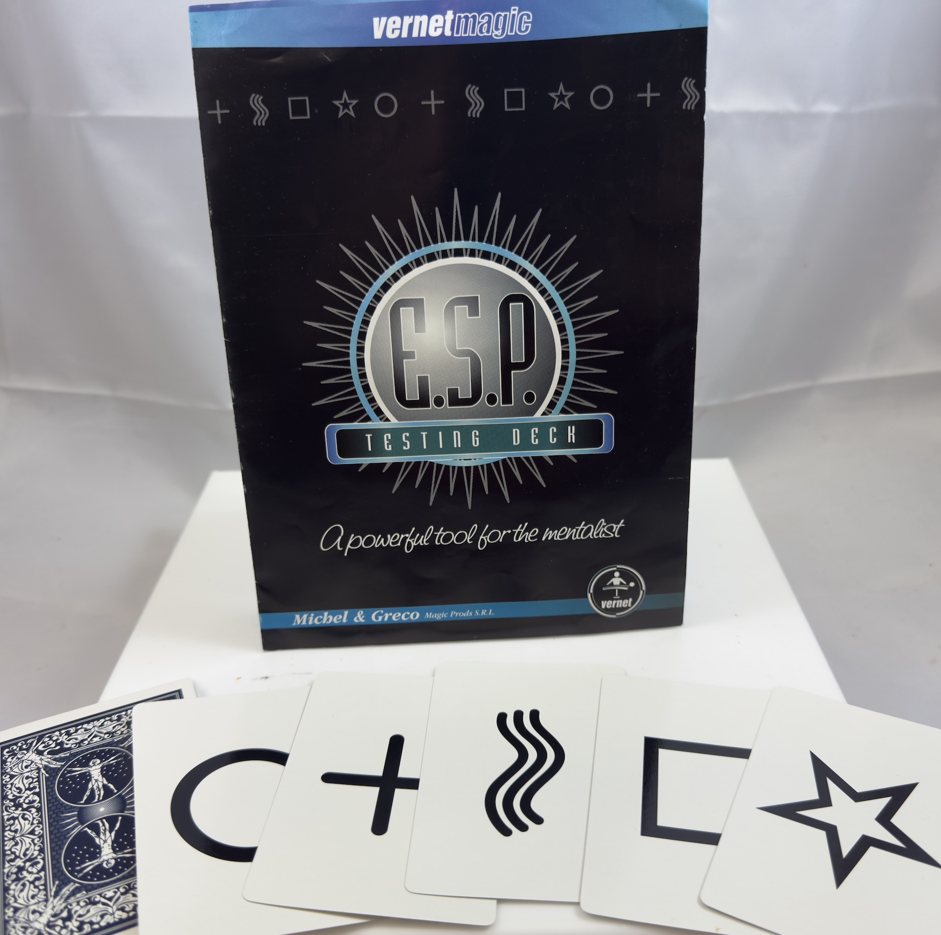 The classic Zener symbols, upgraded for working mentalists. Vernet’s ESP Testing Deck gives you a crisp, professional set of 25 cards (five of each symbol: circle, cross, wavy lines, square, star) with a built-in marking system that’s invisible to your audience—but instantly readable to you. The deck arrives in performer’s order and includes clear instructions with multiple strong routines, so you can go from unboxing to uncanny mind reading in minutes. A compact powerhouse for close-up, parlor, table-hopping, or pre-show work.