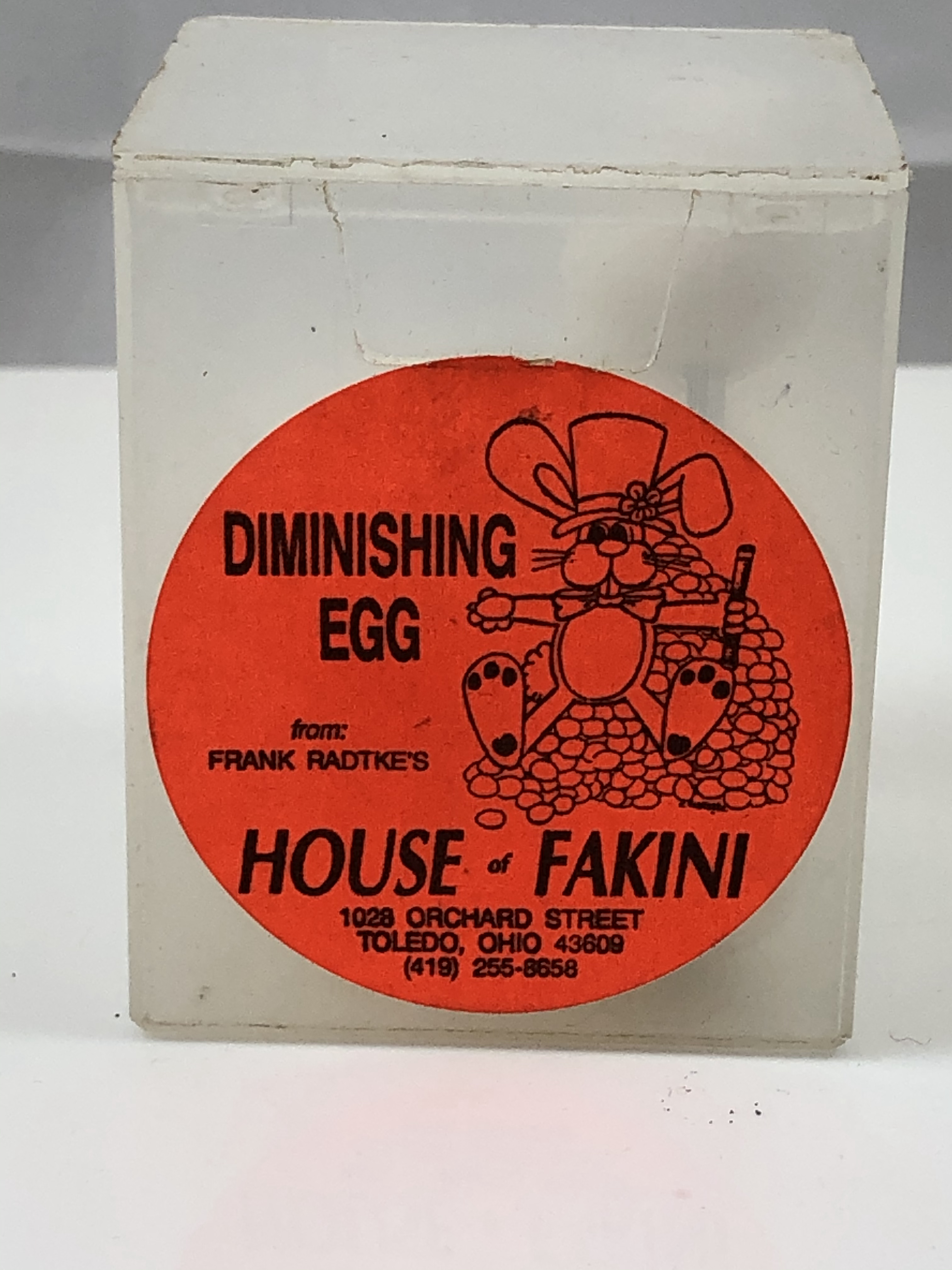 Please Note: We found a few of these in the warehouse. They are in the original containers as sold by House of Fakini. Frank packaged these in two ways, we have some in the clear round tubes with the orange caps and some in the clear square boxes. We can not be sure of their age, etc. They are sold "As Is" for the magic collector. Please note that some of the silicone eggs show some dents from age being in storage. These were never used. We have inspected them and they seem complete but since the manufacting company is long out of business we can't be sure. These are now very rare and sought after by collectors.