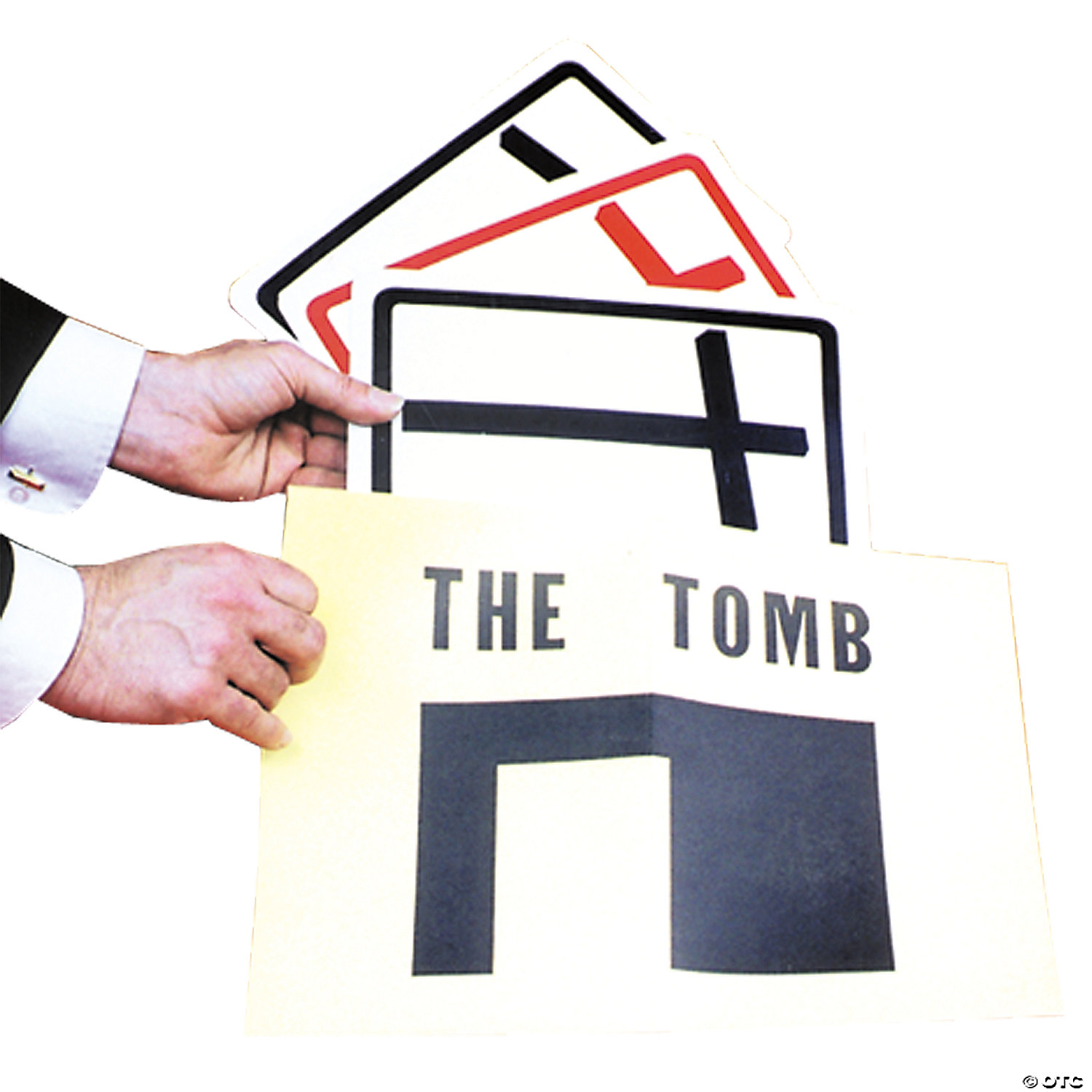 Basic Effect: Three large jumbo cards are shown. Each have printed crosses on them, but the center card is in a different color easily depicting it as Christ on the cross between the two thieves. Usually a child is asked to come to the platform and hold a large folder with a picture of the tomb printed on it. The three cards are placed in the tomb as the crucifixion story is told. The two thief cards are removed leaving only the Christ card in the tomb. However the folder is shown to be empty except for a card with the words “HE IS NOT HERE”. When the audience thinks that the Christ card is on the reverse side and indicate they would like to see it turned over, the words “HE IS RISEN” appear on the back.