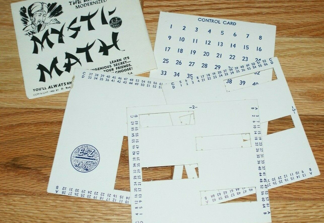 Basic Effect: The spectator thinks of any number on the "Control Card" (they range from 1-64). You then hand her card #1, which has a big square hole in it, and four rows of printed numbers. You ask the spectator which row her thought-of number is in, and after she tells you the row (not the number), you place card #1 onto the control card. You show here cards #2 and #3, which also have four rows of numbers, and four narrow slots cut out in them. After she tells you the row her number is in on each card, you set them down on the pile with the Control Card. When the four cards are squared up, the thought-of number is revealed in the aligned slots.