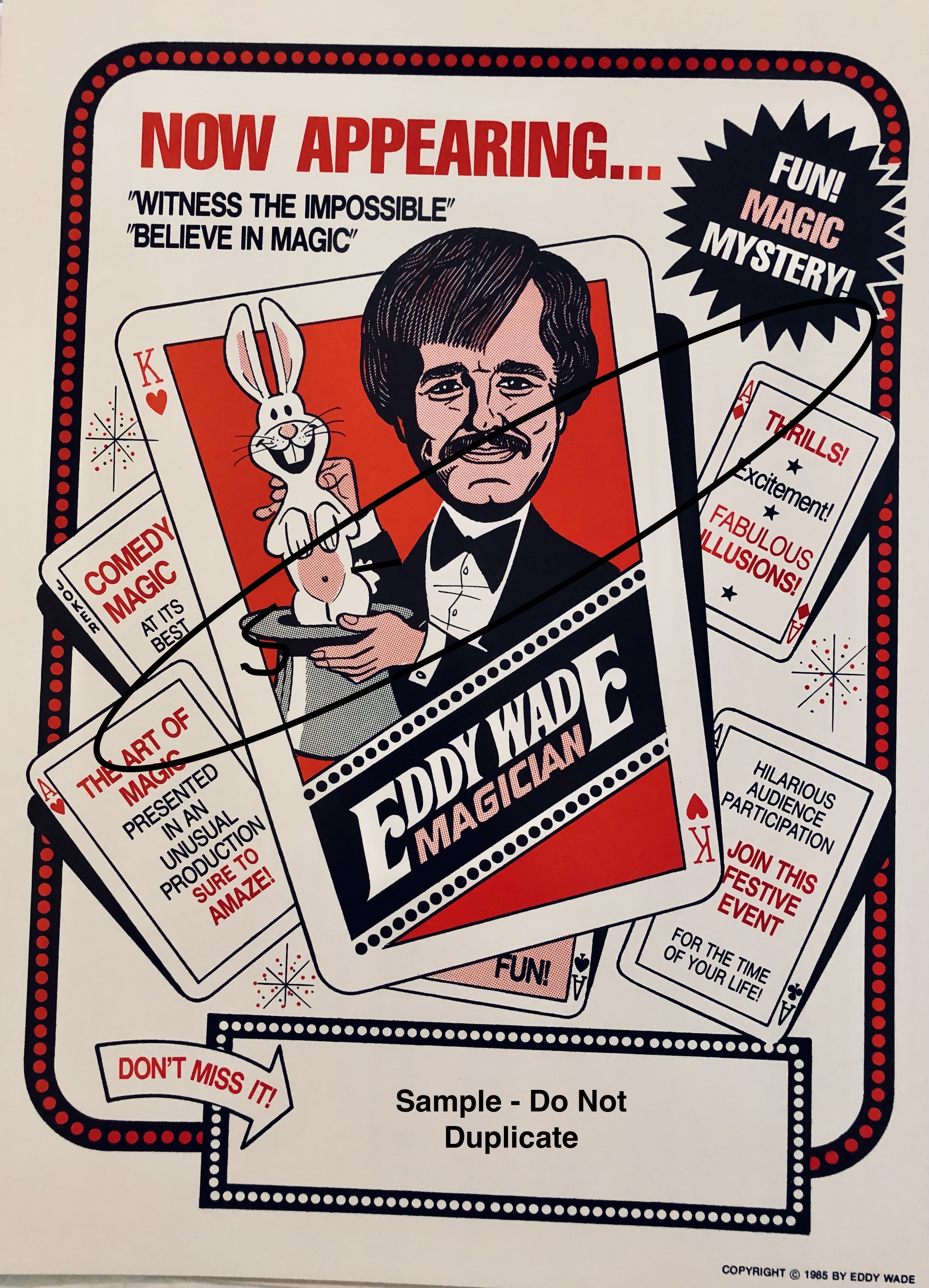 History:The poster was mostly provided to eddy's clients for advertising his appearance at their event, celebration, fundraiser, etc. Occasionally, the posters were sold after performances as souvenirs.The poster concept & layout were conceived by Eddy and hand drawn & executed by famous graphic artist Mr. Ed Harris in 1984.