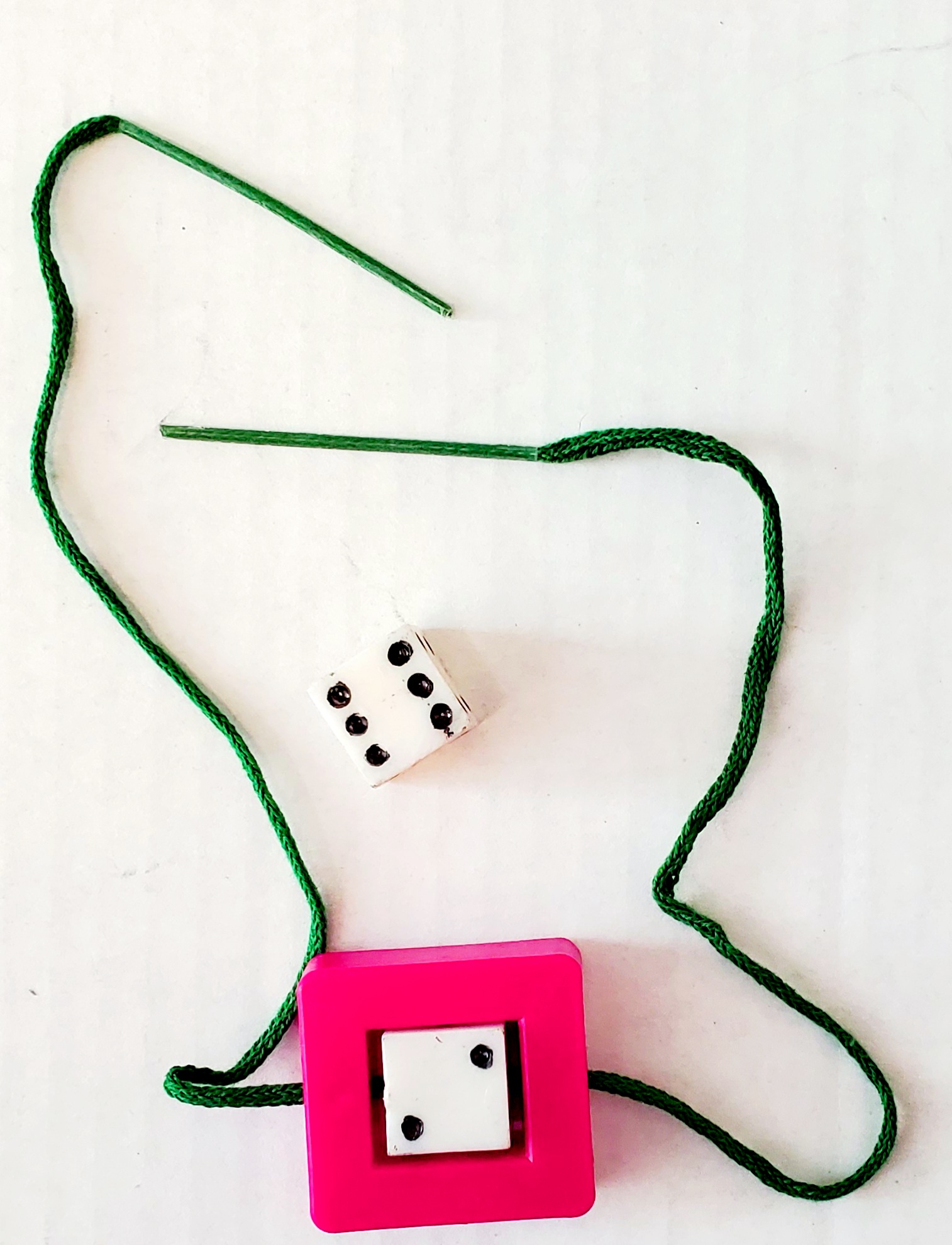 Basic effect: A neat little plastic frame admits a 5/8" red die - there is a hole through the die, also through the left and right sides of the frame. Die is inserted in frame with holes lined up. Spectator threads the silken cord through the frame and die, drawing it back and forth. Spectator cannot remove die when both ends of cord are held. However, performer REMOVES THE DIE while the spectator is still holding both ends of cord. Die, frame and cord are given for inspection.