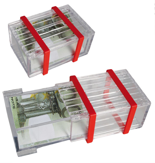 Clear plastic box has a slot in the top. Any coin put inside can not be removed by others, but you can. Very clever method. Self contained and easy to learn.