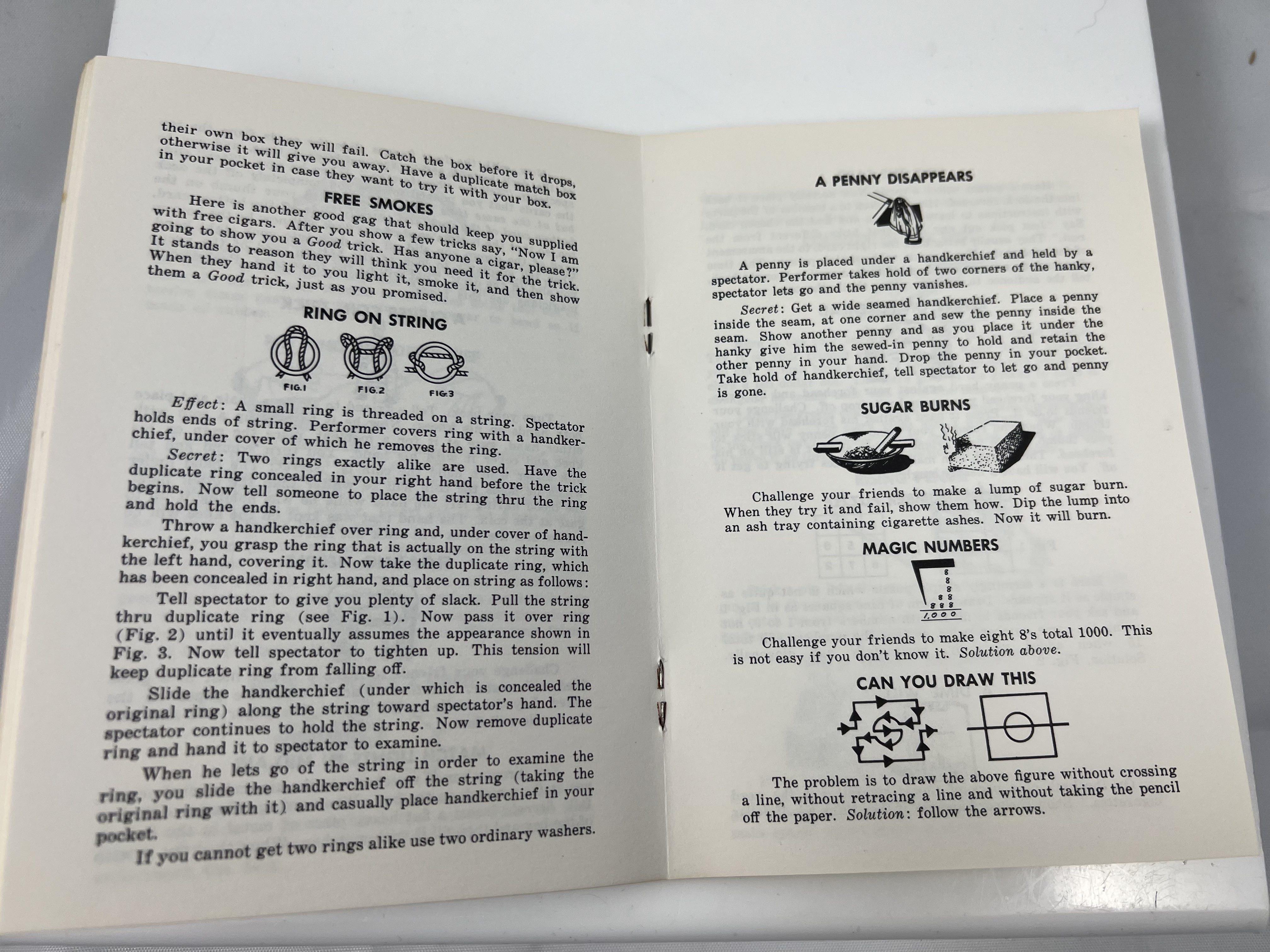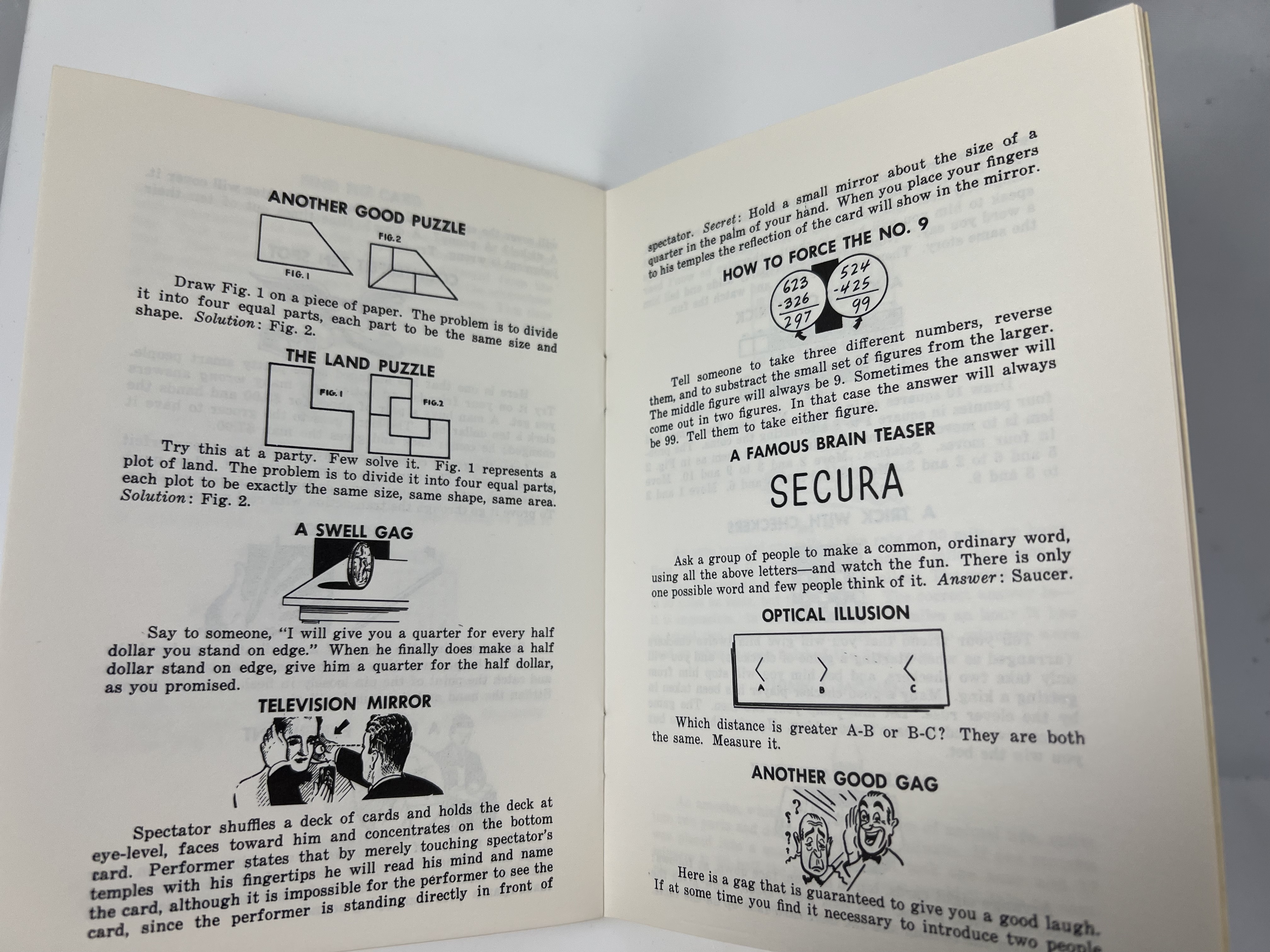 A booklet with Tricks using Rope, Dice, Cards, Coins, Rings, Paper, numbers, pencils, hankerchiefs, cigarettes, etc. In addition, there are Puzzles, Gags, Brian-Twisters, and Party Games.