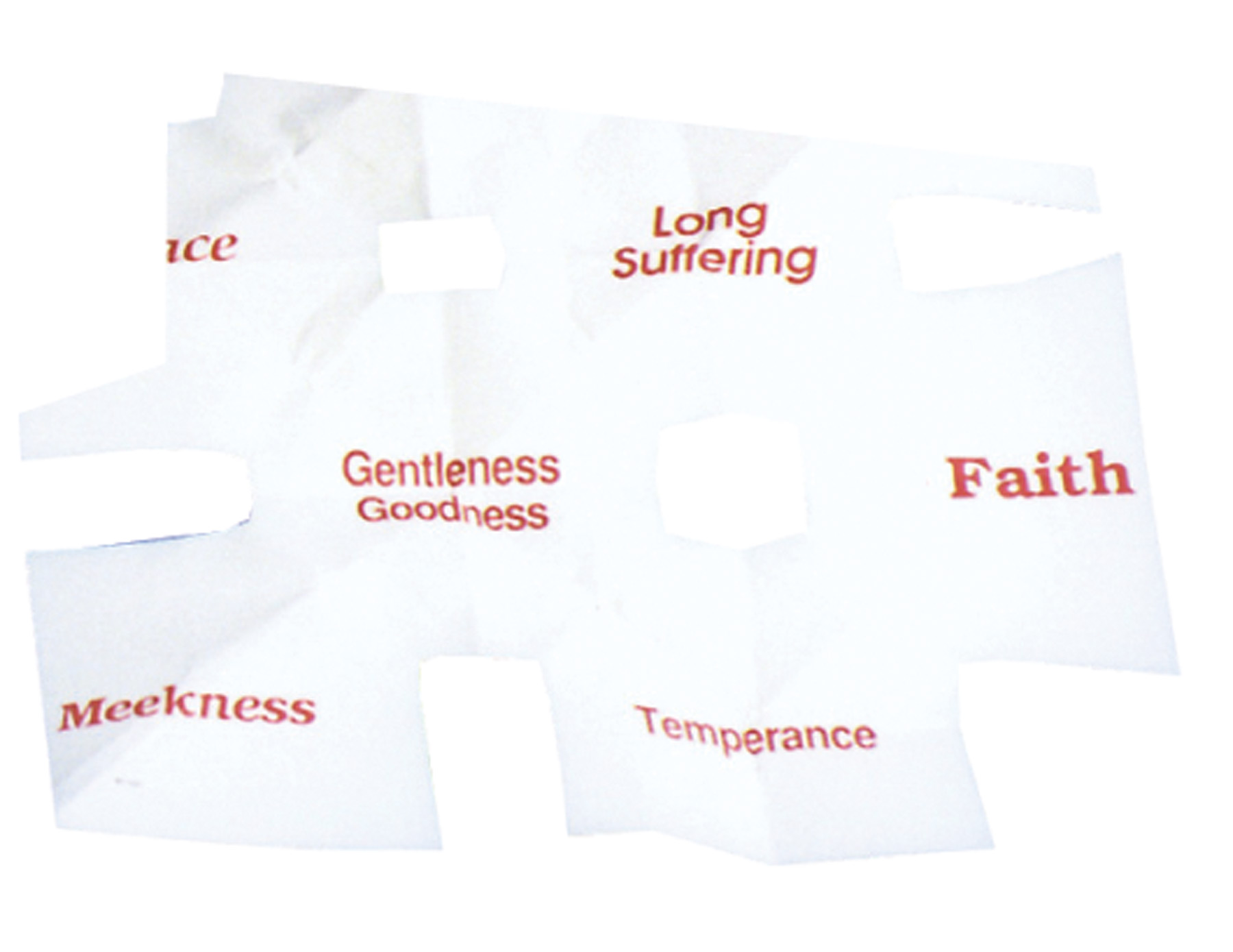Basic Effect: The performer shows a square sheet of paper that is 11-inches square, the audience sees that words are printed on it in a checker board pattern. On it printed in red ink are the nine Fruits of the Spirit. (Galatians 5- 22-23) printed on it, interspersed with these is the word ''SIN'' printed in black. The performer does a few quick folds of the paper, and then with one cut of the scissors he removes all the SIN. What remains is the Fruit Of The Spirit. The performer can hold up the piece of paper and look through the holes that are left. An easy to do magical effect.