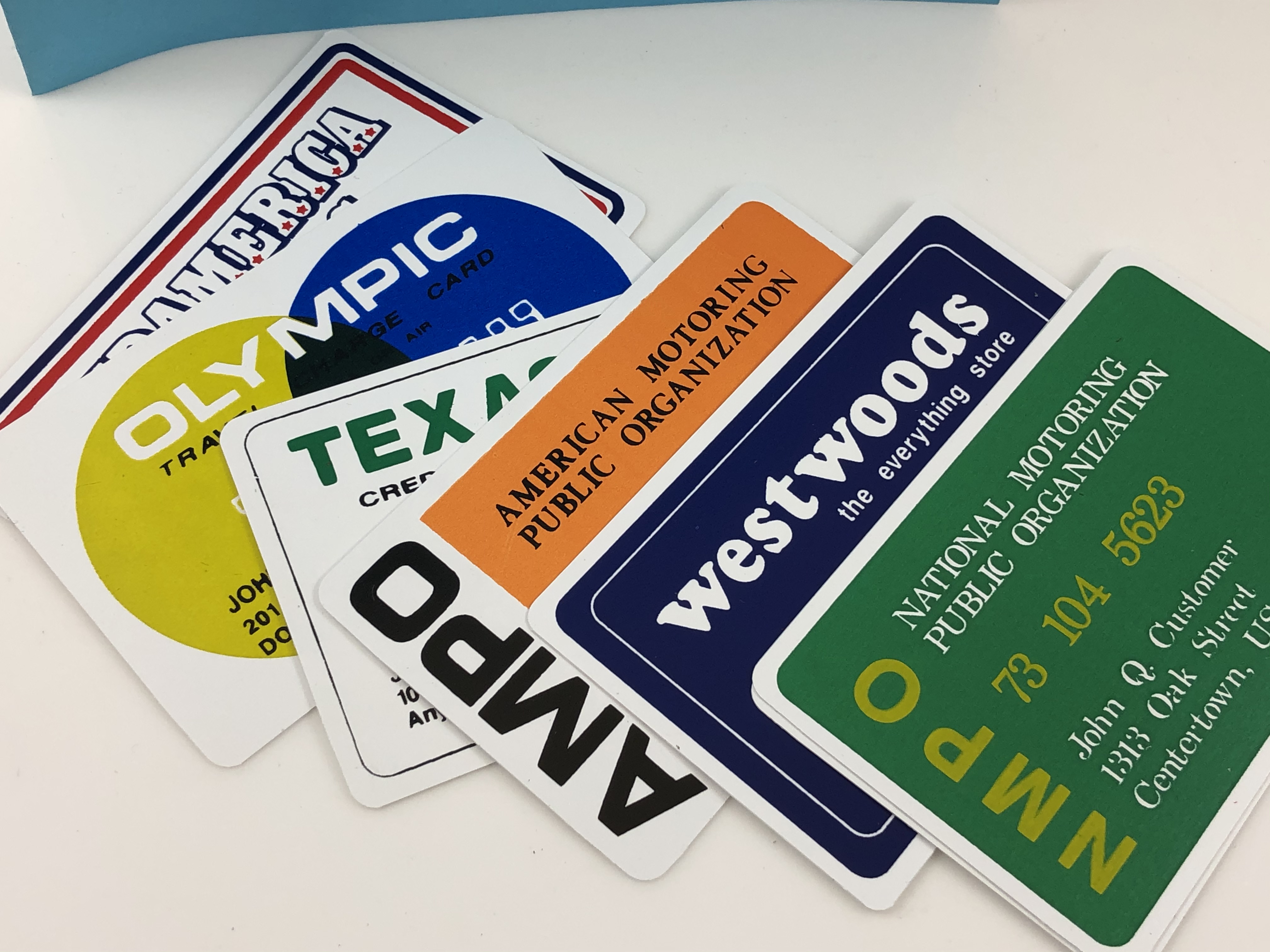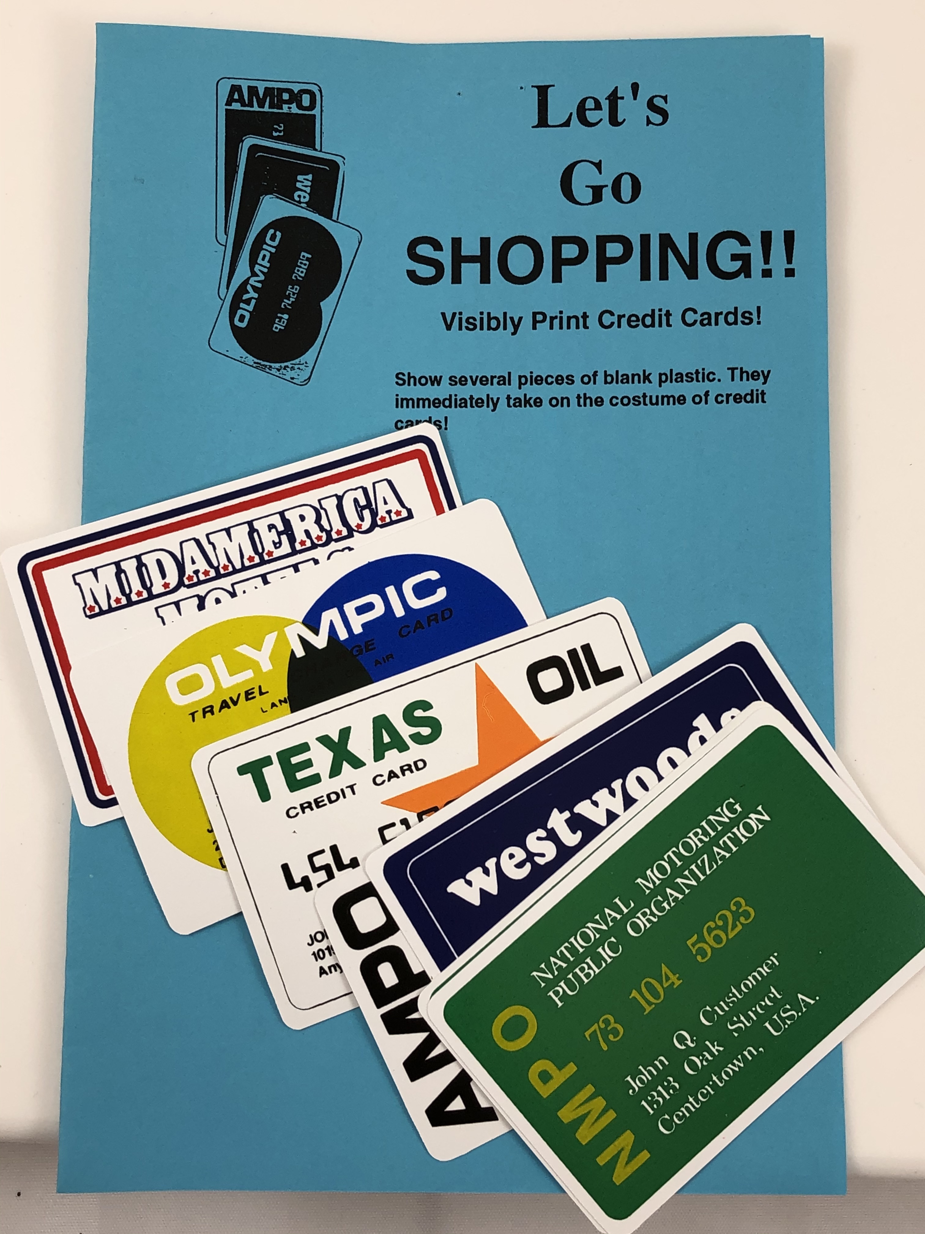 Effect: Show several pieces of blank while plastic similar to the plastic which credit cards are printed on. Then magically they all become printed like a credit card! On the Front and Back! Five different credit cards! After the cards are printed, the performer ends by spreading the cards and saying "Let's Go Shopping"!