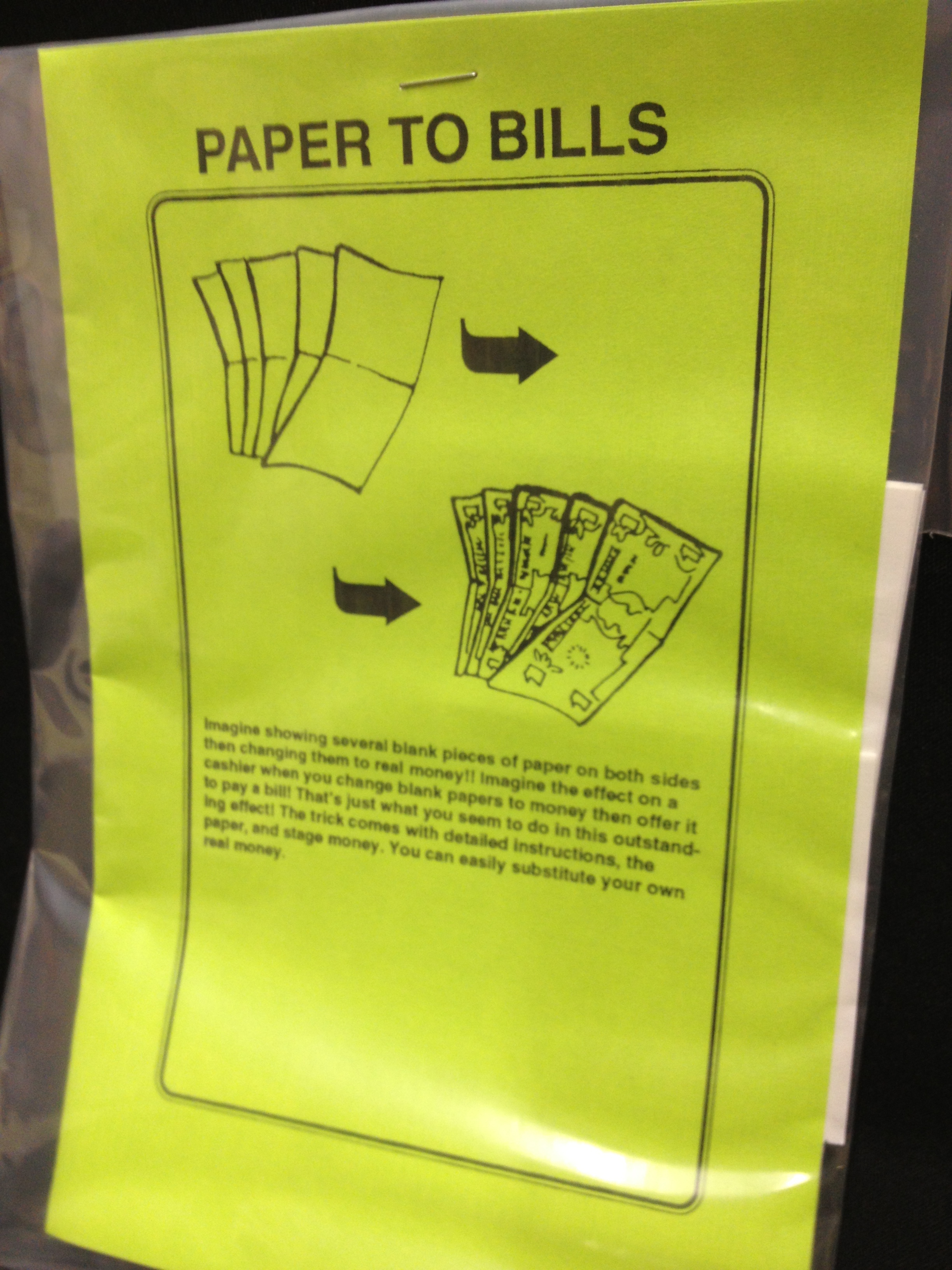 Imagine showing several blank pieces of paper on both sides then changing them to real money!! Imagine the effect on a cashier when you change blank papers to money then offer it to pay a bill! That's just what you seem to do with this outstanding effect! The trick comes with detailed instructions, the paper cut to the correct size and the effect made up in "stage money", for practicing with. You can then copy the set-up we provide to make your own set in Real currency, in whatever denomination you prefer.
