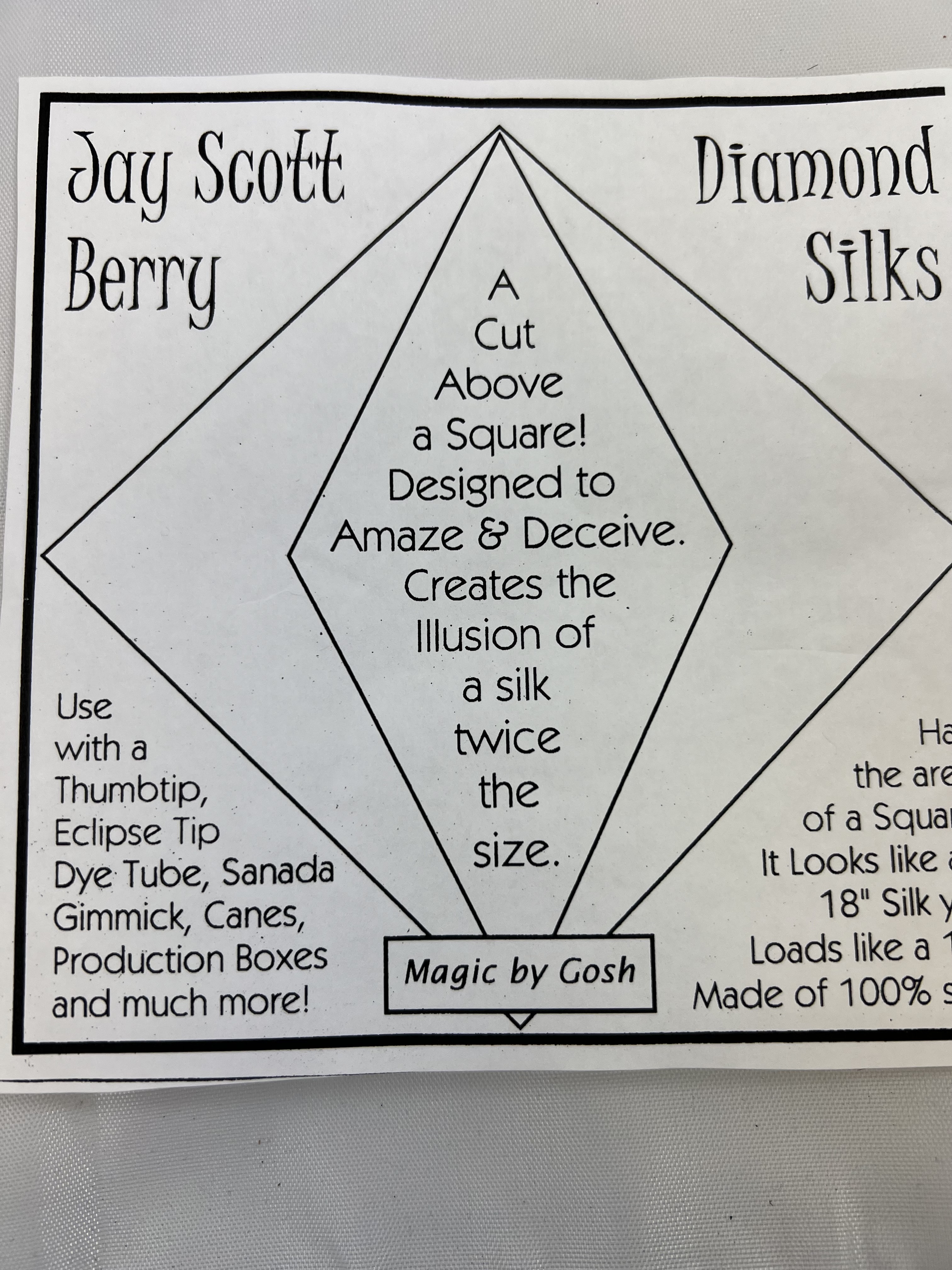 What is a diamond cut silk? It is a silk scarf that has been specially cut and hemmed for use by magicians. Rather than being made in the shape of a square, it is shaped like a diamond. This way it appears to be bigger and longer than it actually is.