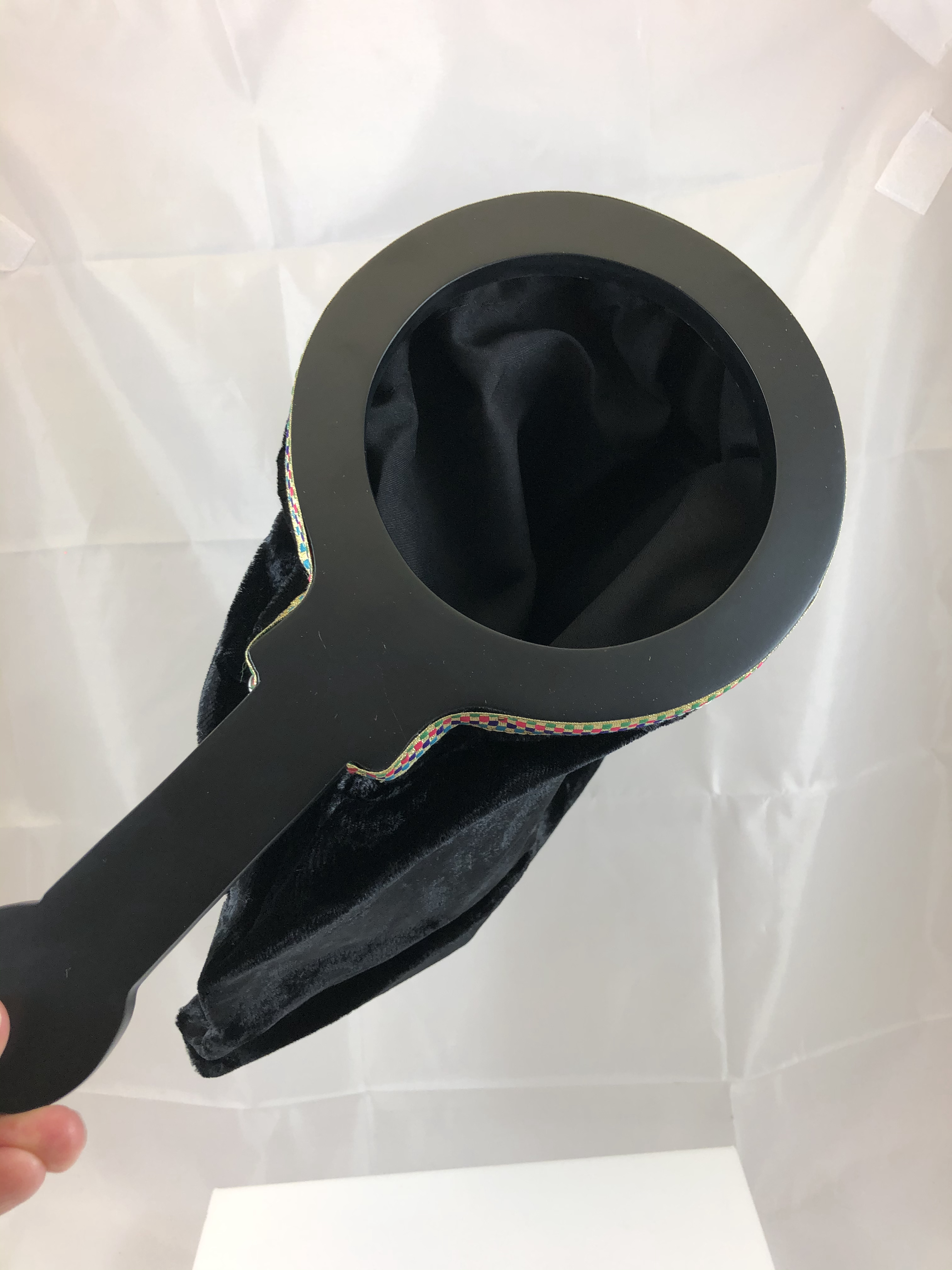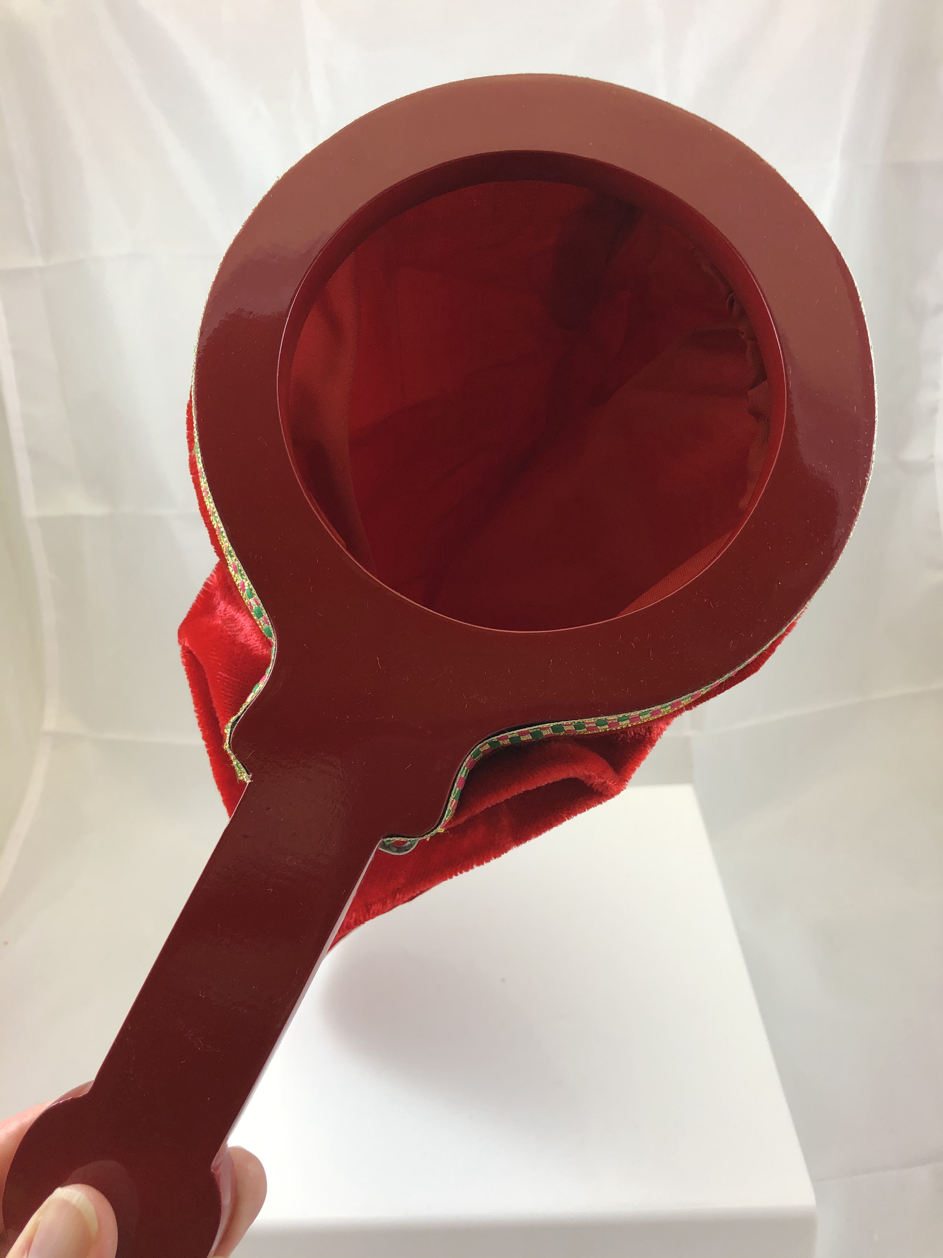 Details: This item has a wood handle with a velvet-like fabric bag complete with a zipper bottom and features one hand operation.