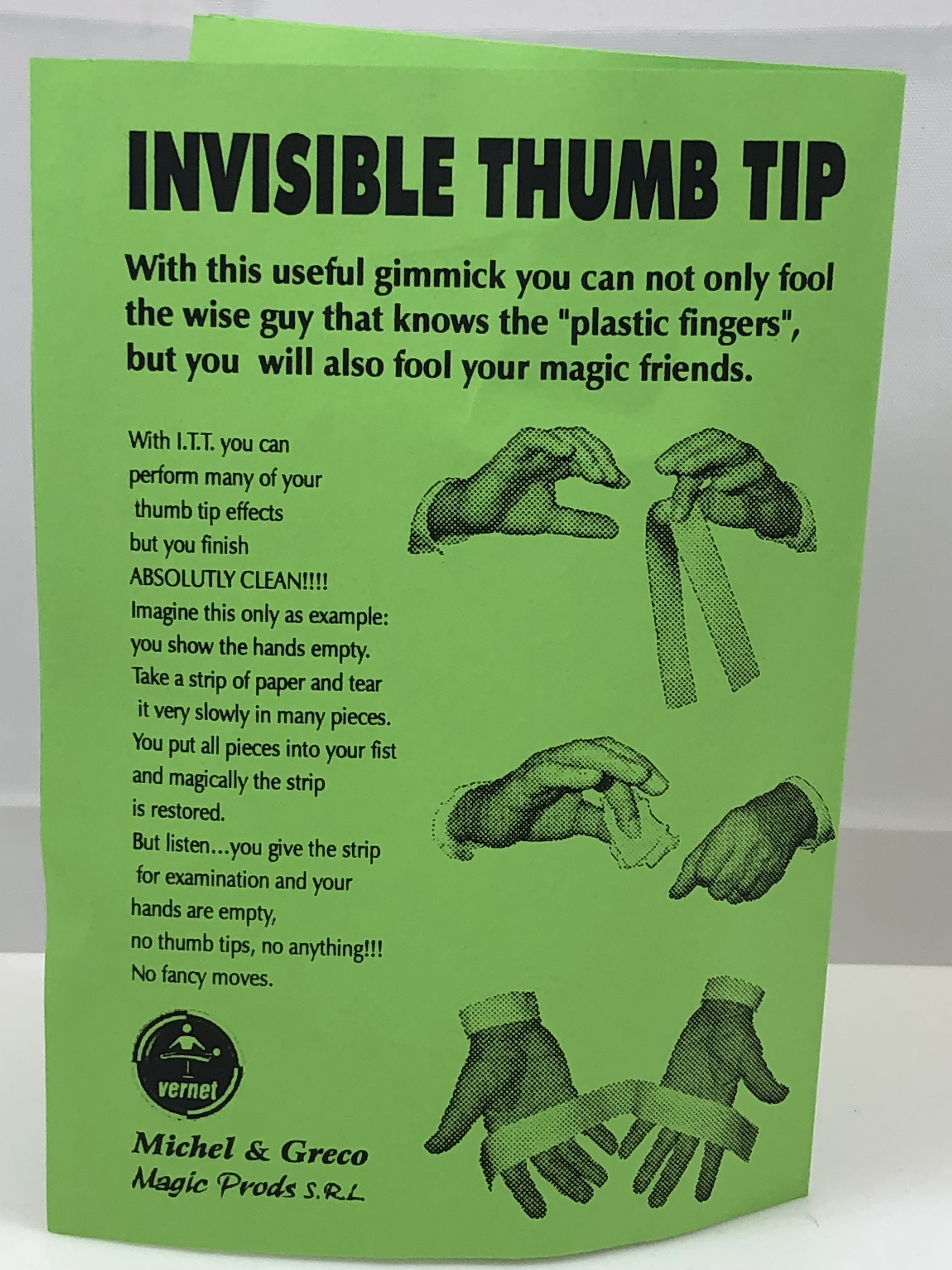 Every magician knowns that the Thumb Tip is a wonderful gimmick, the problem is that it has become quite well known to the lay public. this is not a new problem because in the 1940s the famous New York "Thirteen of Magic" team developed this ingenious gimmick as a solution.