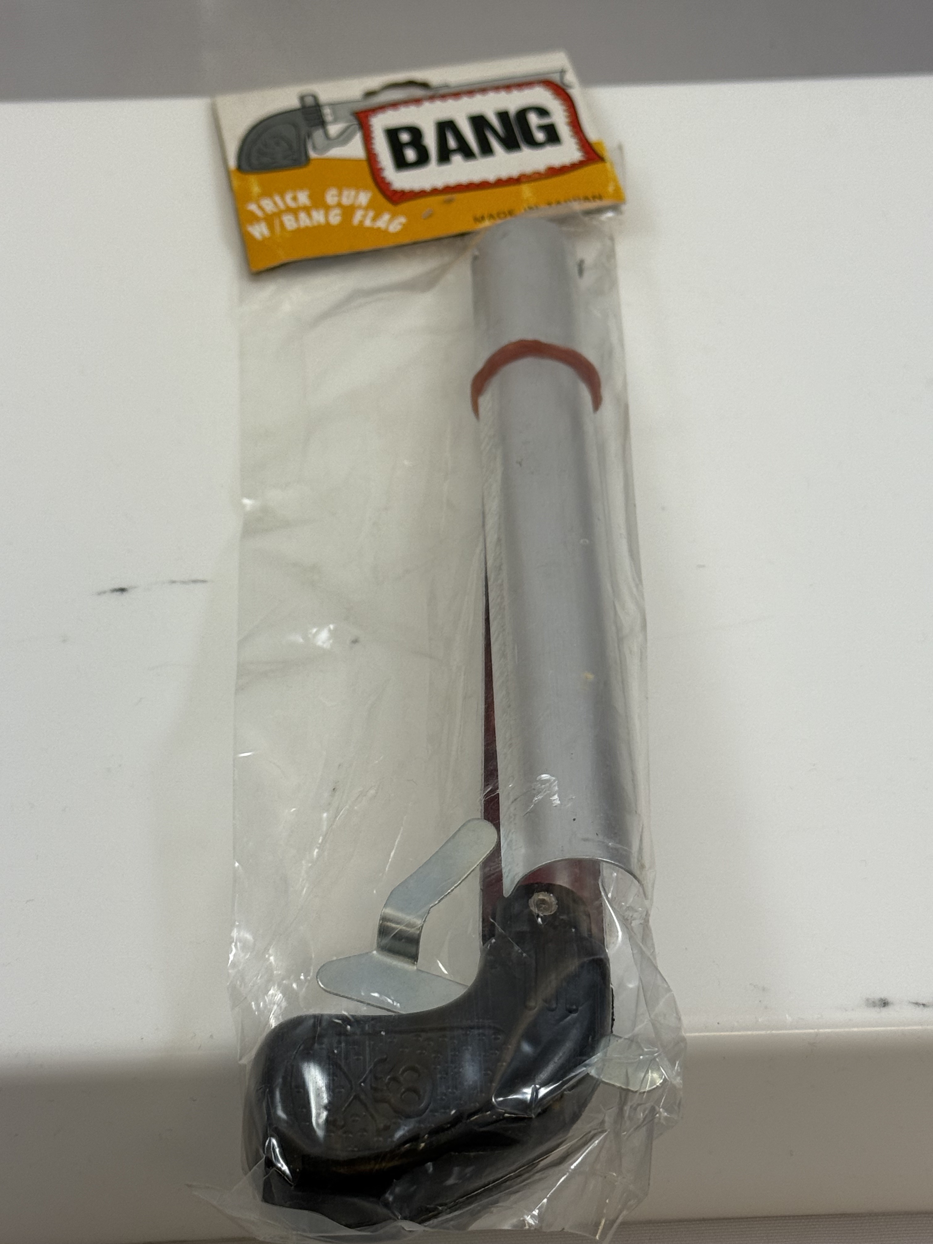 Pull the trigger, and—POP!—the spring-loaded barrel swings open and the nylon flag rolls down, boldly declaring “BANG!” in big letters. The flag measures approximately 10 inches wide by 7 inches tall and is printed on one side only (the reverse side is backward—great for an extra laugh!). When deployed, the full length of the gun stretches to 14 ½ inches, giving it great visibility and comic impact.